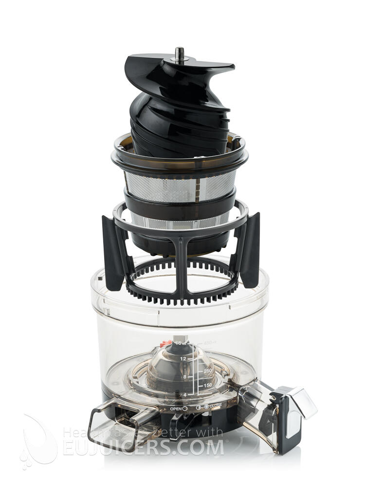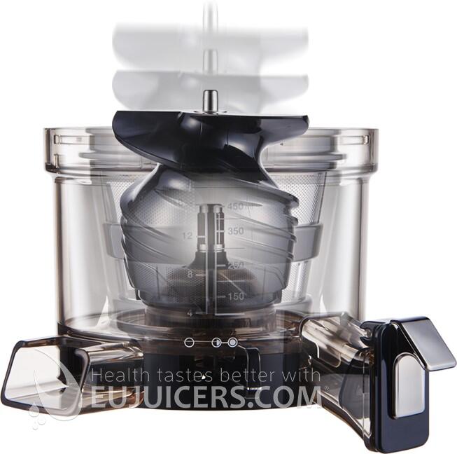 The small improvements did make a difference in daily operation of the 828. We noticed that apple juice had less foam, most likely due to the low rotation speed of the cleaning blades. The motor was the quietest we have tested, noticeably quieter than even the Sana 808. Strangely, the crunching sound of carrots and squeaking sound of apples being processed was quieter as well, almost as if the juicing chamber is better insulated. The wide pulp opening with the large notch taken out of the top made for faster cleaning, although the integrated pulp control lever meant that the rubber stopper under the juicing chamber couldn't be fully removed during cleaning.