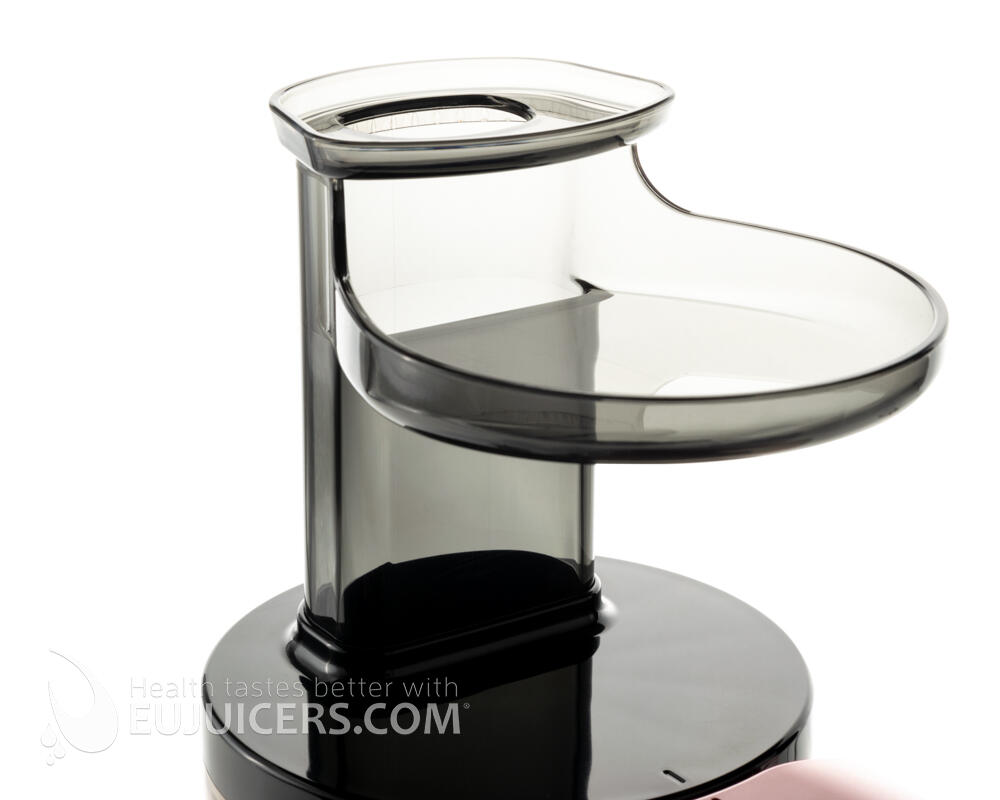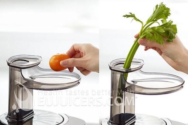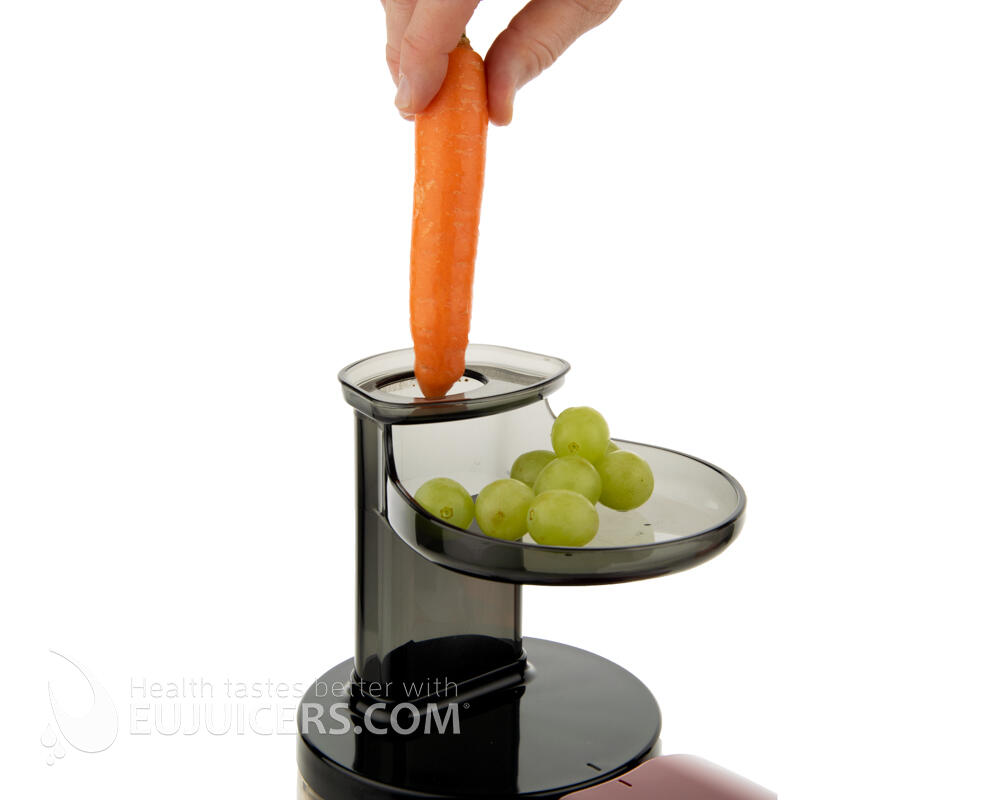 The dual hopper isn't as big as the wide mouth on the Kuvings or MMV. But since we generally cut produce into smaller pieces with verticals, it wasn't an issue. The side tray turned out to be especially useful for spinach, as we could slide a handful of spinach in sideways from the tray, and then push down from the top. This eliminated the usual problem of spinach leaves everywhere on the counter or in the juice.