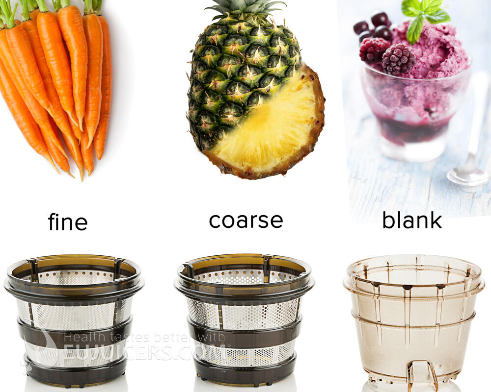The sorbet screen is something not typically found in a vertical juicer. We've seen them as optional accessories on the Kuvings and Omega MMV, so it was nice to see it included here. This one is strictly designed for sorbets and banana-based "ice cream". We wouldn't recommend trying to make nut butter with it.